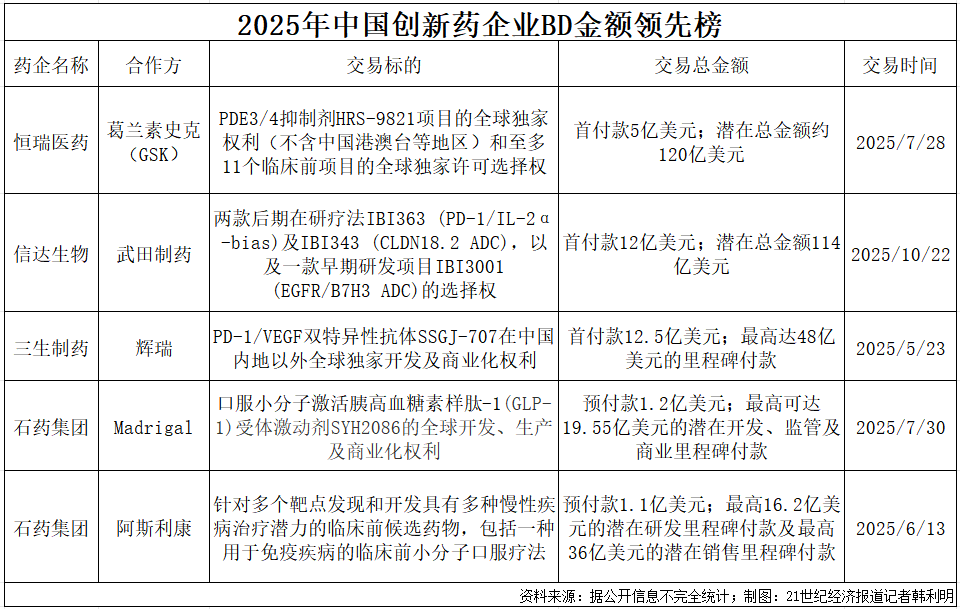 记者丨季媛媛 韩利明 编辑丨张伟贤 BD(商务拓展),曾在生物医药领域融资市场持续收紧的"资本寒冬"中,为中国生物科技公司(Biotech)带来了新的募资契机。 2025年,BD掀起了前所未有的热潮。央视财经数据显示,截至2025年11月18日,国产创新药对外授权总金额已突破千亿美元,相较于2024年 实现了翻倍式增长。手握优质BD项目的Biotech迎来了股价上涨、IPO畅通等红利,更有不少企业提前预告BD进展。 BD交易的持续强劲,既印证了中国医药资产在全球范围内性价比与竞争力的提高,推动行业迈入"创新兑现+全球布局"的关键时期,也引发了 行业对交易质量的深入审视。一方面,"本土创新低卖"等争议随着交易数量的增加而同步升温;另一方面,业内普遍认为,BD交易的考验不 在于签单的金额和数量,而在于协议签署后产品价值落地的实现。 事实也是如此。BD交易对于创新药全球价值的实现固然重要,但BD交易后,产品本身全球价值的逐步验证和实现更为关键。而产品全球价值 的验证和实现主要影响因素包括全球临床的推进、产品数据的发布、竞争格局的变化等。 未来行业BD走向究竟怎样?对此,高特佳投资副总经理于建林向21世纪经济报道记者 ...