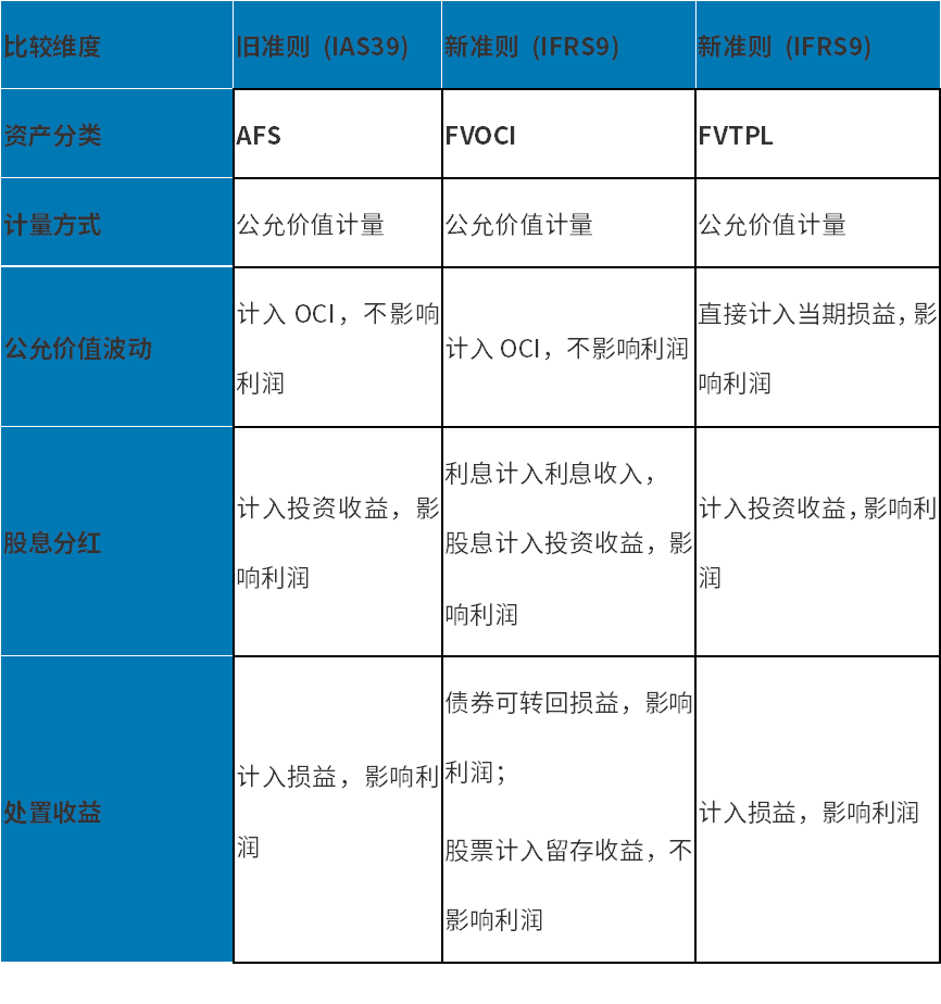 在旧准则IAS39下,保险公司买股票通常归类为"可供出售金融资产"(AFS)。这一分类非常灵活:平时股价的涨跌只计入 资产负债表,不影响当期利润;一旦卖出股票,赚的差价就可以立马确认为当期投资收益,美化利润表 。但在新准则 IFRS9下,这个"两全其美"的分类消失了。股票资产主要面临两种选择:要么归入FVTPL(以公允价值计量且其变动计入当 期损益),要么归入FVOCI(以公允价值计量且其变动计入其他综合收益)。如果选择FVTPL,股价的每一次波动都会直 接穿透到利润表。试想一下,如果碰上牛市当然皆大欢喜,但一旦遇到熊市或震荡市,市值的缩水会直接拖累净利润,导 致业绩出现剧烈的周期性波动,这是追求稳健的保险企业无法接受的 。 图:IAS与IFRS9会计准测区别 | 比较维度 | 旧准则(IAS39) | 新准则(IFRS9) | 新准则 (IFRS9) | | --- | --- | --- | --- | | 资产分类 | AFS | FVOCI | FVTPL | | 计量方式 | 公允价值计量 | 公允价值计量 | 公允价值计量 | | 公允价值波动 | 计入 OCI,不影响 | 计入OCI,不影响利润 ...