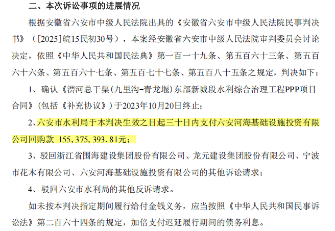 浙江国企赢了!安徽一水利局被当地法院判决:支付1.55亿元款项