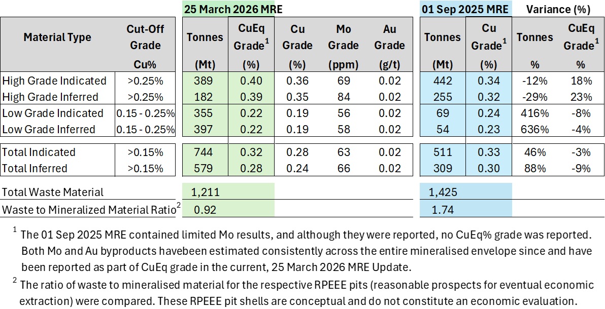 Core Insights - The updated Mineral Resource Estimate (MRE) for the Haib Copper Project shows significant increases in copper equivalent grades and total contained metals, alongside a reduction in the stripping ratio, enhancing the project's economic viability [4][5][6]. Group 1: Mineral Resource Estimates - The MRE as of March 25, 2026, indicates contained resources of 2,090,000 tonnes of copper (Cu) in the indicated category and 1,385,000 tonnes in the inferred category [1][6]. - Total contained copper equivalent (CuEq) is reported at 2,338,000 tonnes in the indicated category and 1,583,000 tonnes in the inferred category [1][5]. - The MRE reflects an 18% increase in high-grade indicated CuEq grade to 0.40% and a 23% increase in high-grade inferred CuEq grade to 0.39% [5][6]. Group 2: Stripping Ratio and Economic Viability - The stripping ratio has been reduced to 0.92 from 1.74, indicating improved efficiency in mining operations [1][5]. - The total contained Cu has increased from 2.6 million tonnes to 3.5 million tonnes, enhancing the overall copper inventory [8][11]. Group 3: Project Development and Future Plans - The Haib project is expected to have a mine life extending from 24 years to potentially over 35 years due to the addition of lower-grade mineralized material [9][11]. - The company plans to deploy 14 drill rigs to complete 50,000 meters of additional drilling by mid-2026, which will inform the next MRE update and the Preliminary Feasibility Study (PFS) [10][15]. Group 4: By-Product Resources - The updated MRE includes significant by-product resources: 487,900 ounces of gold (Au) and 103,600,000 pounds of molybdenum (Mo) in the indicated category, with 380,200 ounces of Au and 84,500,000 pounds of Mo in the inferred category [1][5][6].