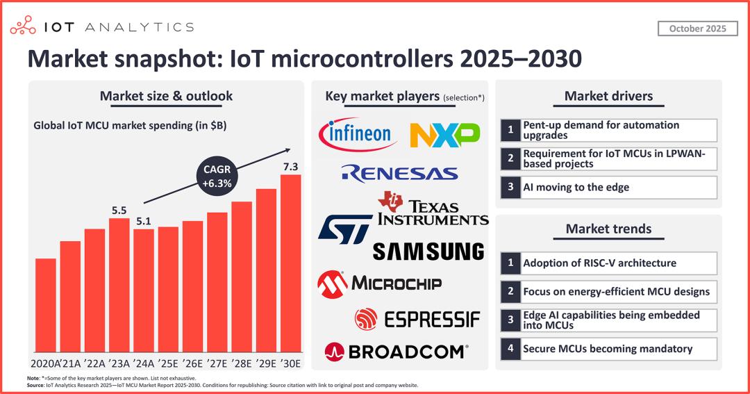 对于物联网 MCU 供应商而言,市场正在复苏,技术不断变革,这意味着供应商必须时刻了解最新趋势,才能在高度集中的市场中保持竞争力;而对那些 使用物联网 MCU 的 OEM/终端用户来说,随着物联网 MCU 变得更加开放、节能、智能和安全,紧跟技术趋势和关键供应商的步伐可能会非常有价值 ——在此背景下,本文将基于 IoT Analytics 最新发布的报告,概述物联网 MCU 市场的近况和未来技术趋势。 MCU ((Microcontroller Unit;微控制单元)是现代电子设备中的"隐形骨干"。如今,数十亿台设备依靠 MCU 实现控制、感知与通信功能,广泛分布于各 行各业。通过在一颗低功耗芯片上集成处理器、存储器以及输入/输出外设,MCU 能够应用于从家用电器、可穿戴设备到汽车与工业机械的各类场景。 物联网 MCU 增长的关键驱动因素 物联网 MCU 是互联设备的"大脑"。与传统 MCU 不同,IoT MCU 专为互联设备而设计,通常结合处理与控制能力,同时集成或支持通信接口。随着物联 网部署的扩展,这类互联 MCU 正成为低功耗、始终在线型应用(如智能电表、工业传感器、联网汽车等)的关键推动力。 根据 ...