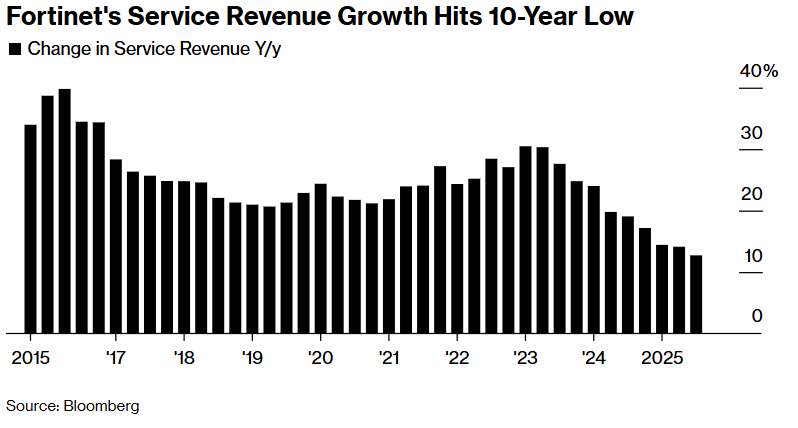 Core Insights - Fortinet Inc. experienced a significant stock decline of over 12% after reporting earnings that fell short of market expectations, particularly in its services segment [1] - The company lowered its revenue guidance for the fiscal year 205, adjusting the upper limit from $6.83 billion to $6.78 billion [5] Financial Performance - For Q3, Fortinet's service revenue grew by 13% year-over-year to $1.17 billion, slightly below Wall Street's average expectations [1] - This growth rate marks the slowest quarterly increase in service revenue for Fortinet in at least a decade [4] - The total revenue for Q3 2025 was approximately $1.72 billion, reflecting a 14% year-over-year increase, with diluted earnings per share at $0.62 compared to $0.70 in the same period last year [1] Market Position and Strategy - Fortinet is recognized as a leading player in the enterprise network security and firewall sector, but it lags behind competitors like Palo Alto Networks and Zscaler in emerging areas such as cloud security, AI security, SASE, and XDR [6] - The company's business model focuses on a combination of hardware and subscription services, with core products including FortiGate firewalls, SD-WAN, and various security gateways [5]