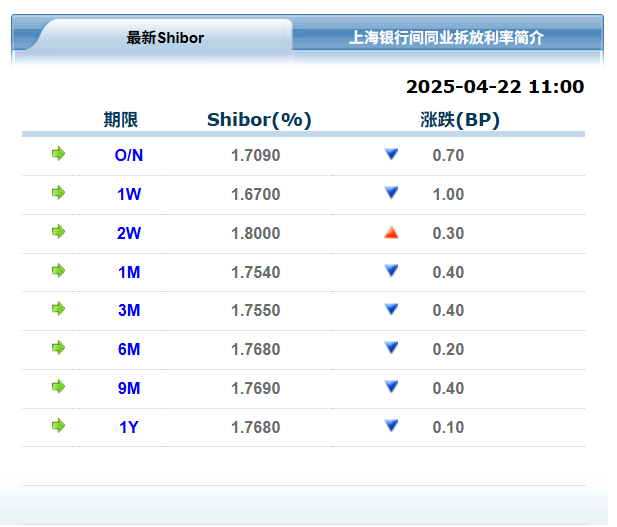 7天SHIBOR报1.6700%,下降1.00个基点。 3个月SHIBOR报1.7550%,下降0.40个基点。 | | 最新Shibor | | 上海银行间同业拆放利率简介 | | --- | --- | --- | --- | | | | | 2025-04-22 11:00 | | | 期限 | Shibor(%) | 涨跌(BP) | | t | O/N | 1.7090 | 0.70 | | f | 1W | 1.6700 | 1.00 | | f | 2W | 1.8000 | 0.30 | | f | 1M | 1.7540 | 0.40 | | t | 3M | 1.7550 | 0.40 | | 中 | 6M | 1.7680 | 0.20 | | t | 9M | 1.7690 | 0.40 | | 1 | 1Y | 1.7680 | 0.10 | 隔夜SHIBOR报1.7090%,下降0.70个基点。 ...