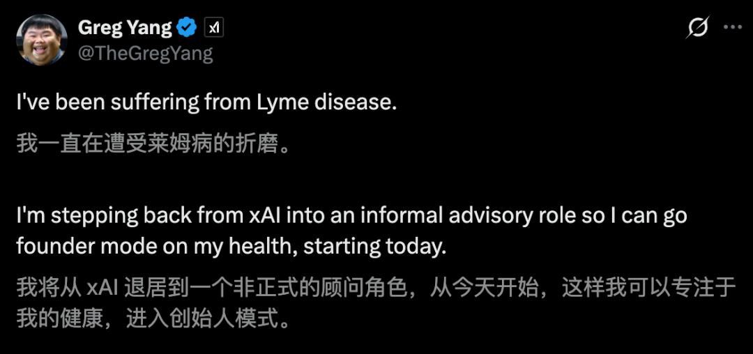 Core Insights - Greg Yang, co-founder and core architect of xAI, has announced his departure from the company due to ongoing health issues related to Lyme disease, transitioning to an informal advisory role [2][5][6] - Yang has been a key figure in developing the mathematical framework behind Elon Musk's vision for "understanding the universe AI" [3][10] Group 1: Departure and Health Issues - Yang's resignation marks a significant loss for xAI, as he was considered a vital member of the team [5] - He has publicly shared his struggles with Lyme disease, which has severely impacted his health and productivity since 2025 [6][8] - Yang's symptoms included extreme fatigue and a decline in creativity, leading to a diagnosis of Lyme disease after extensive medical evaluations [6][8] Group 2: Contributions to AI - Greg Yang is recognized as a mathematical genius and a pivotal figure in AI, having developed the Tensor Programs theory, which aims to transform deep learning into a rigorous science [13][19] - His work has significantly reduced computational costs for training large models, making it feasible to transfer hyperparameters from smaller models to larger ones [19] - Yang's ambition includes establishing a unified theory of large-scale deep learning, which would enhance understanding of neural network expansion and guide safety and alignment research [19] Group 3: Company Context - Yang's departure follows a trend of leadership changes at xAI, with two other co-founders having left the company in the past year [19] - Despite these changes, Musk has promised the launch of Grok 5 in the first half of the year, indicating ongoing developments within the company [20]