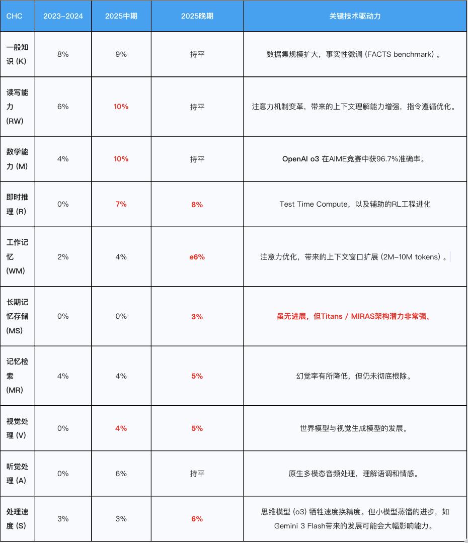 编者按:以定力致远,以重构图新。大象新闻、大象财富联合腾讯新闻、腾讯科技推出2025年终策划《定力与重构》,回望2025、展望2026, 让洞察照见本质,向变革寻求确定。 在刚刚过去的2025年,我通读了大约两百篇人工智能领域的论文。 如果用一个词来形容这一年的技术体感,那就是「暴力美学」时代的终结。单纯依靠堆砌参数摘取低垂果实的日子已经过去,2025年的技术进化回归到了 基础研究。 这篇文章,我想通过梳理这一年的技术脉络,明确三个结论: 第一,2025年,技术进步主要集中在流体推理(Fluid Reasoning)、长期记忆(Long-term Memory)、空间智能(Spatial Intelligence)以及元学习 (Meta-learning) 这四个领域。原因在于Scaling Law在单纯的参数规模上遇到了边际效应递减,为了突破AGI 的瓶颈,业界被迫寻找新的增长点,即从「把模型做大」转向把「模型做聪明」。 第二,现在的技术瓶颈主要在模型要"不仅要博学,更要懂思考和能记住"。 通过Yoshua Bengio提出的AGI框架(基于CHC认知理论),我们发现之前的 AI存在严重的「能力偏科」:它在 ...