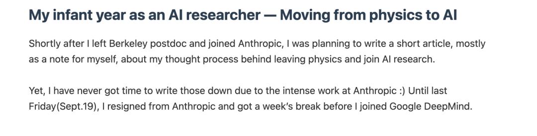 Core Insights - Yao Shunyu, a notable figure in physics, has transitioned from Anthropic to Google DeepMind, marking a significant career shift in the AI field [1][6]. Group 1: Background and Achievements - Yao Shunyu graduated from Tsinghua University in 2019, where he excelled in theoretical physics, particularly in non-Hermitian systems and topological band theory, with his work published in prestigious journals [5]. - After completing his undergraduate studies, he pursued a PhD at Stanford University and later worked as a postdoctoral researcher at UC Berkeley before joining Anthropic [6]. Group 2: Reasons for Transition - Yao expressed a desire to find a field that offers more opportunities for young people, citing the lack of experimental validation in theoretical physics as a limitation [6]. - He believes that while quantum computing will be important in the future, the current bottleneck lies in experimental platforms, leading him to choose artificial intelligence as a more promising direction [6]. - During his time at Anthropic, he contributed to the development of the Claude AI model, helping to enhance it from version 3.7 to 4.5, but felt it was time to move on for personal growth [6][7].