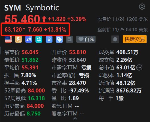 | SYM Symbotic | | | | --- | --- | --- | | 5 460 + +1.820 +3.39% | | 收盘价 11/24 16:00 美东 | | 63.120↑ 7.660 +13.81% | | 盘前价 11/25 04:10 美东 | | 三 24 4 5 8 8 日 ♥自选 | | ● 快捷交易 | | 最高价 56.045 | 开盘价 55.810 | 成交量 408.51万 | | 最低价 51.862 | 昨收价 53.640 | 成交额 2.26亿 | | 平均价 55.391 | 市福率 IM 写损 | 总市值 63.01亿 (-) | | 振 幅 7.80% | 市盈率(静) 亏损 | 总股本 1.14亿 | | 换手率 4.71% | 市净率 28.470 | 流通值 48.12亿 | | 52周最高 84.000 | 委 比 -97.49% | 流通股 8676.82万 | | 52周最低 16.318 | 量 比 1.89 | 每 手 1股 | | 历史最高 84.000 | 股息TTM -- | | | 历史最低 8.750 | 股息率ITM - ...