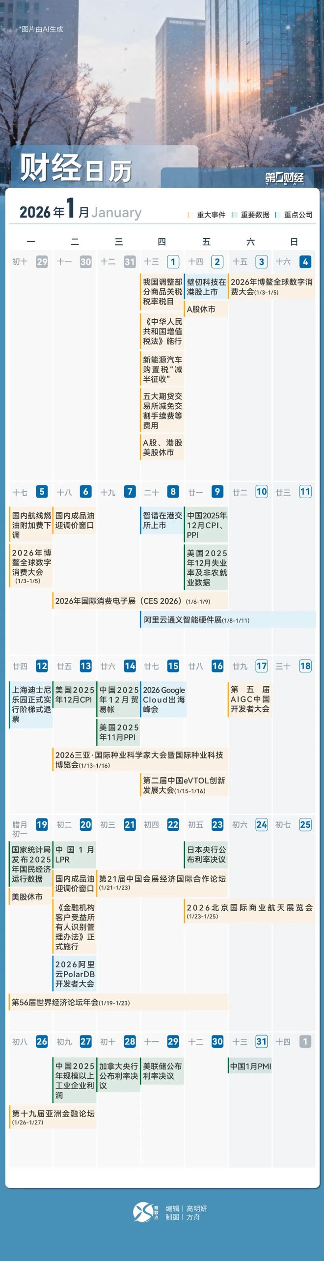 | | | 油附加费下 迎调价窗口 所上市 12月CPI、 PPI 调 2026年博 美国2025 整全球数字 年12月失业 消费大会 率及非农就 (1/3-1/5) 业数据 2026年国际消费电子展(CES 2026)(1/6-1/9) 阿里云通义智能硬件展(1/8-1/11) 02 甘五 13 甘六 14 甘七 15 甘火 16 甘九 17 三十 18 甘四 上海迪士尼|美国2025 中国2025 2026 Google 第 五 盾 乐园正式实|年12月CPI 年12月贸 Cloud出海 AIGC中国 开发者大会 行阶梯式退 易帐 峰会 凯K 美国2025 年11月PPI 2026三亚 · 国际种业科学家大会暨国际种业科技 博览会(1/13-1/16) 第二届中国eVTOL创新 发展大会(1/15-1/16) 25 19 初二 20 初三 21 初四 22 初五 28 初六 24 初七 腊月 初一 日本央行公 国家统计局|中国1月 发布2025 LPR 布利率决议 年国民经济 运行数据 国内成品油 第21届中国会展经济国际合作论坛 迎调价窗口 (1/21-1/23) 美股休市 2026北京国际商业航天展览 ...