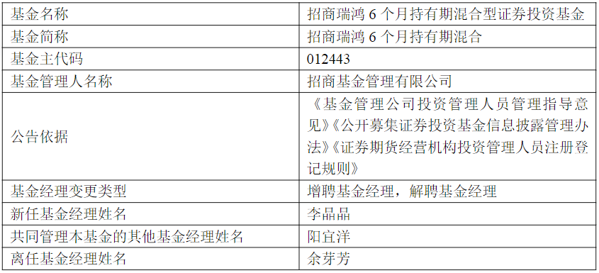 招商瑞鸿6个月持有期混合增聘李晶晶 余芽芳离任