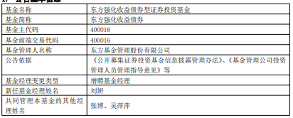 | A+ Art bed more and first | | | --- | --- | | 基金名称 | 东方强化收益债券型证券投资基金 | | 基金间称 | 东方强化收益债券 | | 基金主代码 | 400016 | | 基金前端交易代码 | 400016 | | 基金管理人名称 | 东方基金管理股份有限公司 | | 公告依据 | 《公开募集证券投资基金信息披露管理办法》、《基金管理公司投资 | | | 管理人员管理指导意见》等 | | 基金经理变更类型 | 增聘基金经理 | | 新任基金经理姓名 | 刘妍 | | 共同管理本基金的其他经 | 张博、吴萍萍 | | 理姓名 | | (责任编辑:康博) 刘妍2017年3月加盟东方基金,曾任交易员、信评研究员、投资经理,此后任基金经理助理、基金 经理。 东方强化收益债券A/C成立于2012年10月09日和2025年11月18日,截至2026年02月13日,其今年来 收益率为1.40%、1.39%,成立来收益率为74.13%、1.50%,累计净值为1.6463元、1.3666元。 中国经济网北京2月24日讯 今日,东方基金公告,东方强化收益债券增聘刘妍。 ...