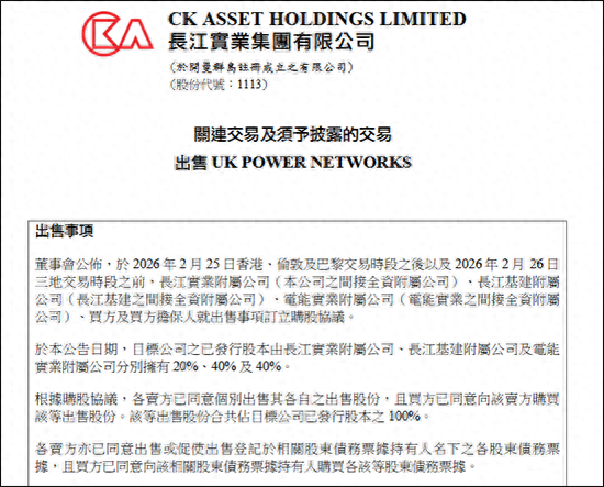 港交所网站消息,2月26日,长江实业集团有限公司发布公告称:长实附属公司、电能实业附属公司等 已与买方英国安集集团(Engie UK)及其担保人订立购股协议,决定悉数出售其持有的英国电网(UK Power Networks)全部股权。 公告文件显示,英国电网公司目前由长江基建和电能实业各持股40%,长实集团持股20%。根据协议, 各卖方已同意分别出售其持有的所有股份,合计共占目标公司已发行股本的100%。也就是说,长和系 旗下的这三家公司这次是联手将该英国电网资产"清仓"式转让给了买方。 有消息人士透露,以商业价值推算,长和系在2010年以约57.75亿英镑收购英国电网,此次出售价值已 升至168.68亿英镑。股权价值也从当初的25.53亿英镑增至目前的110.78亿英镑。加上历年累计44亿英镑 的分红,该项目的现金回报已超过6倍。 本文系观察者网独家稿件,未经授权,不得转载。 | CK ASSET HOLDINGS LIMITED | | --- | | 長江寶業集團有限公司 | | (於財量解島往冊成立之有限公司) | | (股份代號:1113) | | 關連交易及須予披露的交易 | | 出售 UK PO ...