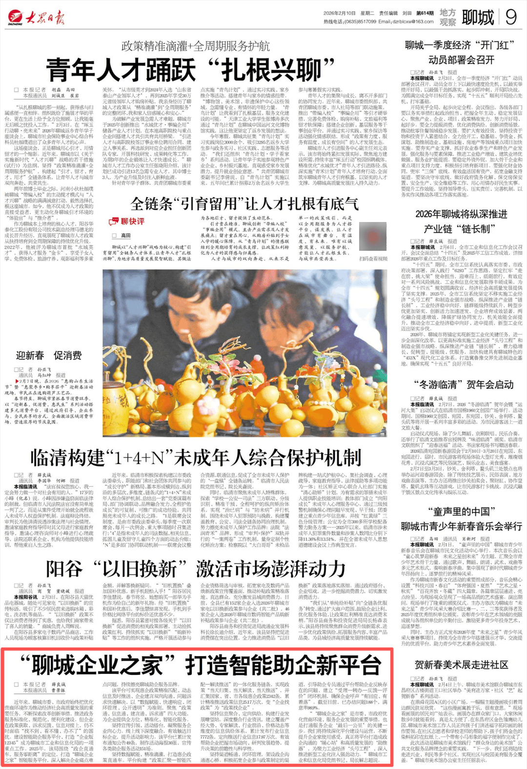 2026年2月10日 星期二 责任编辑 刘田 第614期 地7方 线电话:(0635)8517099 Email:dzrblcxw@163.com 观察 日00 切 聊城一季度经济"开门红" 动员部署会召开 藤皮该 报道 本报聊城讯 2月6日,全市工业和信息化工作会议召 会议全面总结"十四五"及2025年工信工作成效,详细 2026年重点工作及目标任务, 口记者:孙幸飞 报道 本报副情讯 2月3日,在市一季度经济"开门红" 动员 都署会议召开,动员会市下以最快速度轮先机,以最快发 措开好局,以最强干抓落实、超少网申博 开展快报。 X原满完成会年目标任务,实现"十五五" 顺利开局抢占先 机,打牢基础 推动批零生餐领域稳步发展。要扩大有效投资,坚持投资了 物和投资于人紧密结合,全力推开工,稳基础、急资金融、急资金 谋划、助推测造业、基础设施、规划、高等等等重点。 实施,要存实产业支撑,抓获农业委等产业产权,建筑工业投资 做强,服务业扩能提质。要稳定外资外贸,加大骨干企业和 重占项目支持力度,积极拟引进商新项目。要强化财会情 拓宽金融支持 ,保交房保安 山东早生家 tta " 底线,有效盘活国有资产 x 11-22 ...