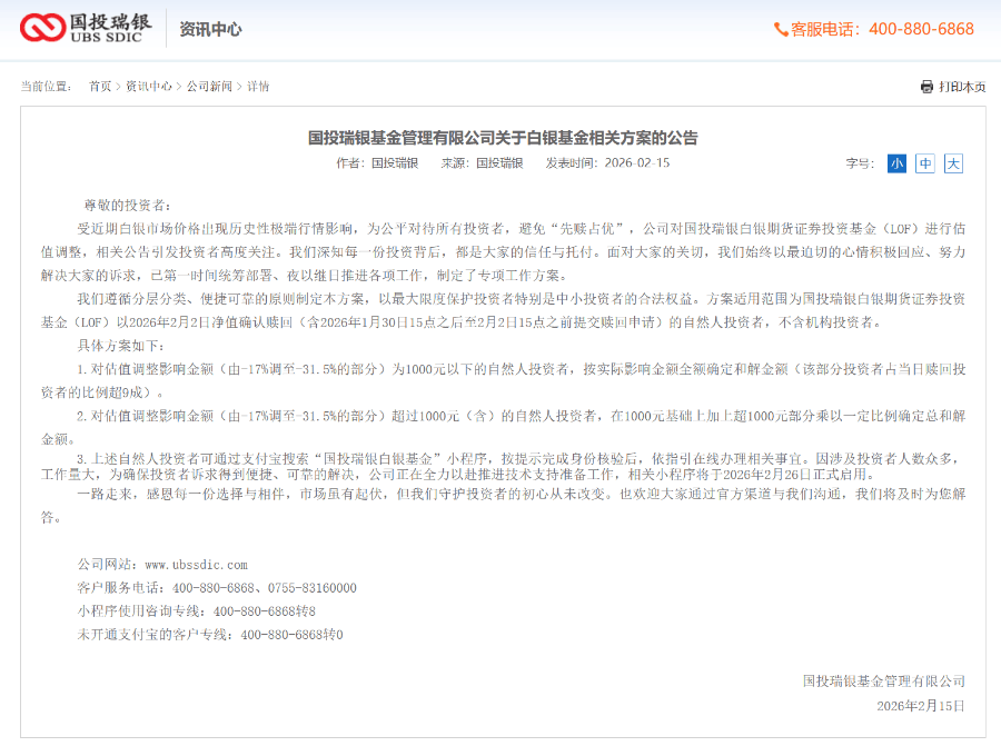2月15日晚间,国投瑞银发布《关于白银基金相关方案的公告》,公布了此前国投白银LOF估值调整事件受影响投资者的补偿方 案,其中对受影响金额1000元以下者进行全额补偿。 公告称,上述自然人投资者可通过支付宝搜索"国投瑞银白银基金"小程序,按提示完成身份核验后,依指引在线办理相关事 宜。因涉及投资者人数众多,工作量大,为确保投资者诉求得到便捷、可靠的解决,公司正在全力以赴推进技术支持准备工 作,相关小程序将于2月26日正式启用。 每日经济新闻综合公开消息 每日经济新闻 具体方案如下: 1.对估值调整影响金额(由-17%调至-31.5%的部分)为1000元以下的自然人投资者,按实际影响金额全额确定和解金额(该部 分投资者占当日赎回投资者的比例超9成)。 2.对估值调整影响金额(由-17%调至-31.5%的部分)超过1000元(含)的自然人投资者,在1000元基础上加上超1000元部分乘 以一定比例确定总和解金额。 3.上述自然人投资者可通过支付宝搜索"国投瑞银白银基金"小程序,按提示完成身份核验后,依指引在线办理相关事宜。 ...