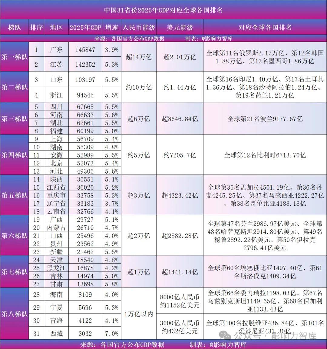 2026年刚开年,中国31个省份陆续公布2025年GDP成绩单,这份经济排名榜单不仅展现区域经济格局演变,更在全球坐标中呈现出"富可敌国"的国家量级 对比。 按照经济体量划分,中国逐渐形成清晰的八大梯队,其规模可直接对标全球主要经济体,构成世界经济版图中独特的中国实力展示。 值得注意的是,多个省份已经具备全球中等强国经济能级,从单极驱动到多极共进的区域经济新格局已然成型,开启中国参与全球经济竞合新生态。 浙江则以9.45万亿元逼近10万亿关口,约为1.36万亿美元能进世界20强,而且有望2026年成为中国第四个10万亿省份。 有意思的是,两省增速恰巧同为5.5%,均高于全国5%的平均水平,展现出东部沿海省份的发展韧性。 四川6.76万亿元、河南6.66万亿元、湖北6.26万亿元、福建6.01万亿元四大省份组成6万亿第三梯队。 | | | | | | 中国31省份2025年GDP对应全球各国排名 | | | | --- | --- | --- | --- | --- | --- | --- | --- | | 梯队 | 排序 | 地区 | | 2025年GDP 增速 人民币能级 | | 美元能级 | 对应全球各 ...
