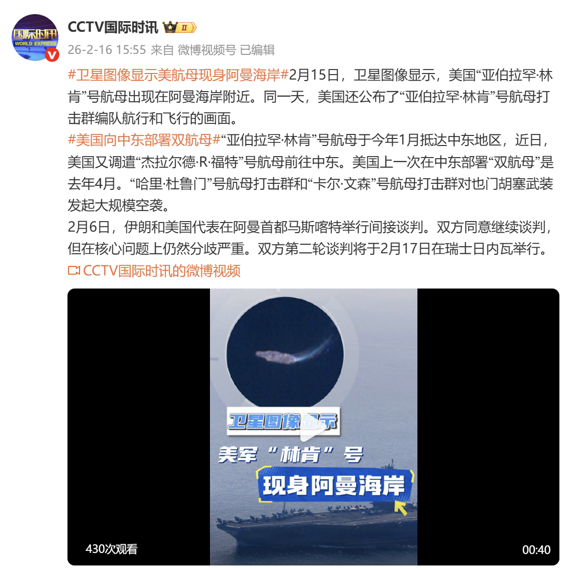 本文转自【CCTV国际时讯】; 2月15日,卫星图像显示,美国"亚伯拉罕·林肯"号航母出现在阿曼海岸附近。同一天,美国还公布了"亚伯拉罕·林肯"号航母打击群编队航行和飞行的画面。 "亚伯拉罕·林肯"号航母于今年1月抵达中东地区,近日,美国又调遣"杰拉尔德·R·福特"号航母前往中东。美国上一次在中东部署"双航母"是去年4月。"哈里· 杜鲁门"号航母打击群和"卡尔·文森"号航母打击群对也门胡塞武装发起大规模空袭。 2月6日,伊朗和美国代表在阿曼首都马斯喀特举行间接谈判。双方同意继续谈判,但在核心问题上仍然分歧严重。双方第二轮谈判将于2月17日在瑞士日内 瓦举行。 ...