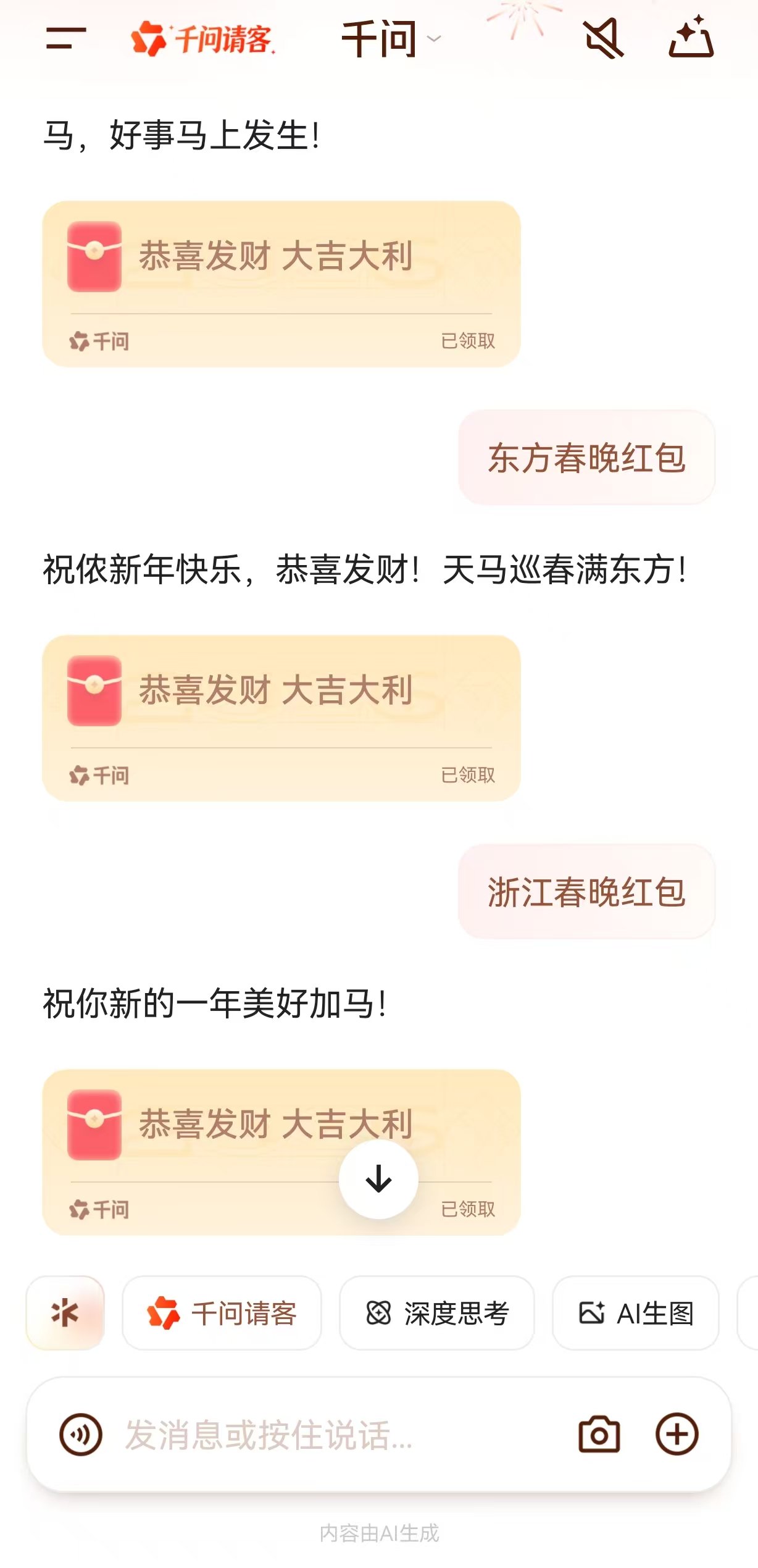 格隆汇2月17日|据网友反馈,此刻打开千问,输入"江苏春晚红包","东方春晚红包"、"浙江春晚红包",均可以领取红包。(格隆汇) 祝你新的一年美好加马! 恭喜发财 大吉大利 ← 已领取 字干问 水 6 Al生 千问请客 ⑧ 深度思考 发消息或按住说话 ... (T (·)) 内容由AI生成 ...