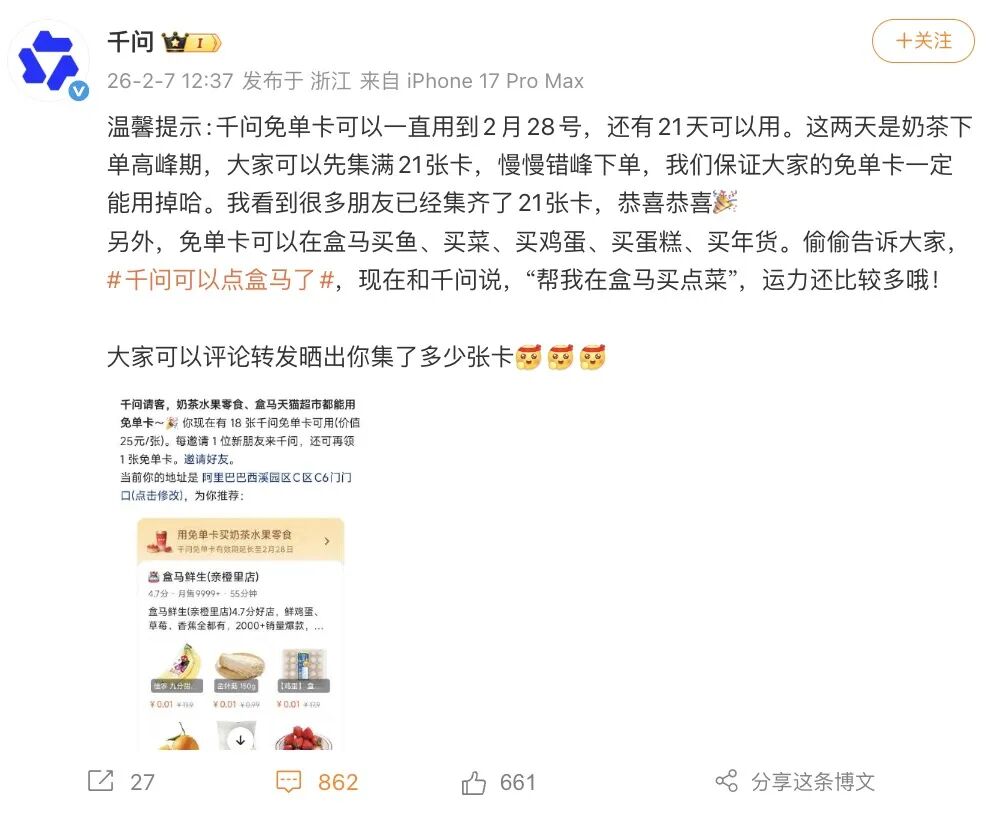 新京报贝壳财经记者 程子姣 张晓慧 编辑 阎侠 校对 张彦君 ▲记者实测用千问点到盒马0.01元草莓。应用截图 红包大战点奶茶"堵车",千问回应"保证能用掉" AI竞赛全面升温后的首个周末,一幕极具反差的场景出现:本应是技术与算力比拼的战场,却被最传统的互联网拉新打法重新定义。 线下奶茶店意外火爆,成为这场AI大战里的另类赢家。送奶茶,已然成为AI行业内卷中,最朴实也最有效的"送鸡蛋式"获客手段。 千问一句"瓜分30亿红包",让不少人喝上0.01元的奶茶,亦有手快者已经享用上盒马的0.01元草莓。 前有元宝10亿元现金红包,后有千问"请客分30亿",大厂之间AI入口之争愈演愈烈。2月7日,千问下场后的第一个周末,用千问点奶茶从早上便开始"拥 挤",千问App"紧急"宣布将免单卡有效期从2月23日延长至28日,并强调可用于在盒马买鱼、买菜、买鸡蛋、买蛋糕、买年货等多品类商品。 千问方面回应新京报贝壳财经记者称,将保证用户的免单卡一定能用掉。新京报贝壳财经记者检索发现,免单卡可以一直用到2月28日,还有21天可以使 用。 活动上线初期,在千问App获得25元免单卡后,点击"去下单",千问App界面会自动输出"千问 ...