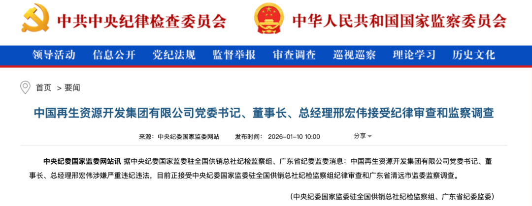 中国再生资源开发集团有限公司党委书记、董事长、总经理邢宏伟被查。 据中央纪委国家监委驻全国供销总社纪检监察组、广东省纪委监委消息:中国再生资源开发集团有限公司党委书记、董事长、总经理邢宏伟涉嫌严重违纪 违法,目前正接受中央纪委国家监委驻全国供销总社纪检监察组纪律审查和广东省清远市监委监察调查。 此前,2025年12月20日,中国再生资源集团全资控股的中再资源环境股份有限公司(中再资环,600217)发布公告称,公司董事会于2025年12月19日收到 公司董事长邢宏伟递交的书面辞职报告,邢宏伟因个人原因申请辞去公司第八届董事会董事长、董事、董事会战略委员会主任委员和委员及薪酬与考核委 员会委员等职务,同时不再担任公司法定代表人。离任后,邢宏伟不再担任公司任何职务。 综合自:中央纪委国家监委网站、中国再生资源开发集团官网、上市公司公告 (文章来源:证券时报) 中国再生资源开发集团官网显示,公司成立于1989年,是国家推动再生资源行业发展、保障国家资源安全的重要抓手。现有出资企业200余家,年销售额 600亿元,再生资源业务量超3000万吨/年,业务涵盖家电拆解、机动车再利用、动力电池回收利用、再生金属、产业资源+ ...