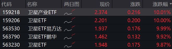 1月12日,商业航天相关ETF集体爆发,截至发稿,卫星产业ETF(159218)、卫星ETF(159206)、卫 星ETF易方达(563530)、卫星ETF鹏华(563790)均涨停,卫星ETF(563230)触及涨停。 | 代码 | 名称 | 两日图 | 现价 | 涨跌 | 涨跌幅 ▼ | | --- | --- | --- | --- | --- | --- | | 159218 | 卫星产业ETF | n | 2.374 | 0.216 | 10.01% | | 159206 | P星ETF | n | 2.201 | 0.200 | 10.00% | | 563530 | 卫星ETF易方达 ~ | | 1.937 | 0.176 | 9.99% | | 563790 | 卫星ETF鹏华 | n | 1.462 | 0.132 | 9.92% | | 563230 | 卫星ETF | 14 n | 1.948 | 0.175 | 9.87% | 国家无线电频谱管理中心深度参与ITU事务的专家表示,向ITU申报卫星网络资料是各国卫星操作单位 部署卫星系统的第一步。 按照相关规定,使用卫星频率轨道资源部署卫 ...
