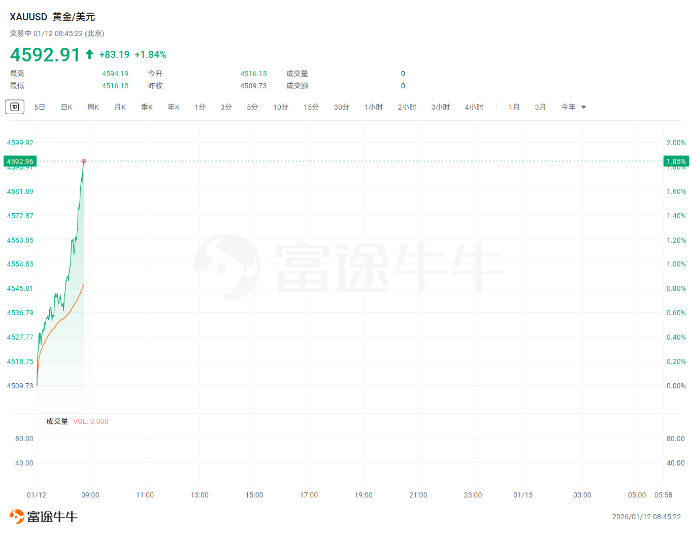 伊朗方面的最新事态正在成为主导全球大宗商品市场的新逻辑。 1月12日周一避险情绪显著升温,现货黄金日内涨近1%,升至4550美元大关,再创历史新高。 白银涨幅扩大至2.7%,价格继续位于82美元的历史高位水平。 原油市场同样反应剧烈,布伦特原油和WTI原油双双涨超1%。数据显示,布伦特原油在经历了上周四和周五近6%的跳涨后,目前正逼近每桶64 美元关口,创下自10月以来的最大两日涨幅;WTI原油价格则维持在60美元附近。 市场焦虑的核心在于伊朗局势周末突变。当地时间1月11日,据央视新闻记者获悉,美国官员透露,美国总统特朗普正在考虑干涉伊朗的多种方 案,包括宣布向中东派遣航母战斗群、发动网络攻击和信息战等。另据新华社报道,特朗普将于13日与高级顾问会晤,专门讨论伊朗问题选项。 这一地缘政治风险盖过了此前市场对全球供应过剩的担忧。作为OPEC第四大产油国,伊朗近200万桶/日的原油出口面临中断风险,这直接改变了 投资者的预期。目前,市场正密切关注华盛顿方面的下一步决策以及德黑兰方面的应对措施。 避险买盘涌入 原油期权显露看涨信号 伊朗局势的动荡直接刺激了资金涌入大宗商品市场。油价已连续第三天上涨。 市场数据的变 ...