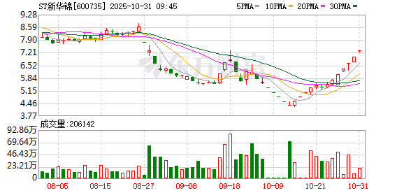 ST新华锦盘中涨停,已连收5个涨停板,截至9:25,该股报7.32元,换手率0.20%,成交量83.57万股, 成交金额611.73万元,涨停板封单金额为6758.12万元。连续涨停期间,该股累计上涨27.75%,累计换 手率为27.83%。最新A股总市值达31.39亿元,A股流通市值31.14亿元。 据天眼查APP显示,山东新华锦国际股份有限公司成立于1993年11月28日,注册资本42877.8219万人民 币。(数据宝) 近日该股表现 | 日期 | 当日涨跌幅(%) | 换手率(%) | 主力资金净流入(万元) | | --- | --- | --- | --- | | 2025.10.30 | 4.97 | 2.49 | 1121.47 | | 2025.10.29 | 5.06 | 10.90 | -2160.10 | | 2025.10.28 | 4.98 | 2.18 | 1094.07 | | 2025.10.27 | 5.06 | 12.06 | 1810.93 | | 2025.10.24 | 4.18 | 9.21 | -537.05 | | 2025.10.23 | 3.19 | 7. ...