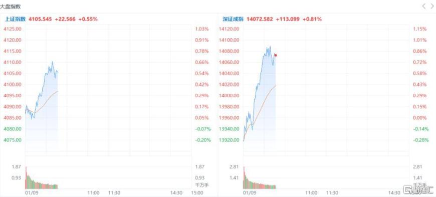 1月9日,A股三大指数集体上扬。 截至发稿,沪指上破4100点再创十年新高,日内涨0.55%,深成指涨0.81%,创业板指微涨。沪深两市成交额连续第155个交 易日突破1万亿元,较上一日此时放量超900亿元。 中信建投研报表示,根据A股上市公司业绩跟踪体系,从三季报的情况来看,沪深300、创业板综的超预期值高于历史平均 水平,中证500超预期值低于历史同期均值。总体来看,把握结构性行情,精选超预期个股,关注基本面修复的大盘成长投 资机会。 此前,高盛分析师发布报告指出,中国企业盈利2026年可能增长14%,2027年或增长12%,有助于提振股市表现。在"希望 到增长"的周期中,将存在10%的估值重估潜力,Kinger Lau等分析师在报告中写道,重申中国股市到2027年可能上涨38%。 股票频道更多独家策划、专家专栏,免费查阅>> 责任编辑:栎树 板块上,军工、贵金属、商业航天、多元金融、量子科技、可控核聚变等板块涨幅居前。 ...