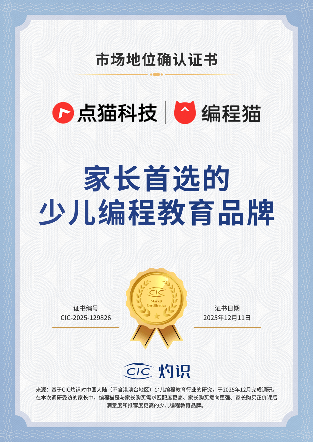 编程猫取得CIC灼识“家长首选的少儿编程教育品牌”的市场地位声明