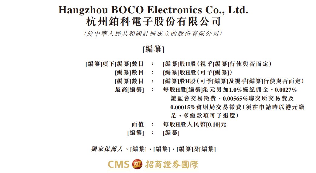 獨家保薦人、[編纂]、[編纂]、[編纂]及[編纂] CMS 2 招商證券國際 Hangzhou BOCO Electronics Co., Ltd. 杭州鉗科電子股份有限公司 (於中華人民共和國註冊成立的股份有限公司) [编纂] 智通财经APP获悉,据港交所1月12日披露,杭州铂科电子股份有限公司(简称:铂科电子)向港交所主板递交上市申请,招商证券国际为其独家保荐 人。招股书披露,铂科电子是全球领先且中国第一大的高性能算力服务器电源供应商,为广泛的工业、消费及商业电能转换应用赋能。根据弗若斯 特沙利文的资料,按2024年源自高性能算力服务器电源的收益计,公司在全球及中国内地算力服务器电源市场的份额分别为8.9%及18.9%。公司的 产品主要服务于专用算力(即 为特定目的或功能执行计算任务)及 AI算力(目前主要使用为实现通用目的而设计的图形处理器(「GPU」)),满 足对输出功率、效率、功率密度及可靠性的严格要求。 [编纂]股H股(視乎[编纂]行使與否而定) [编纂]項下[编纂]數目 : [编纂]數目 : [编纂]股H股(可予[编纂]) [编纂]數目 [编纂]股H股(可予[编纂]及視乎[编纂]行使與否而定) ...
