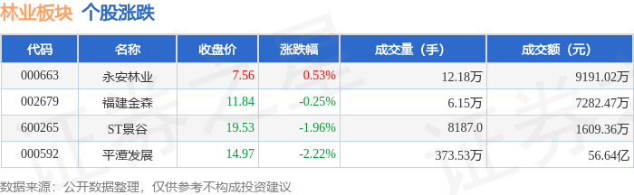 证券之星消息,1月8日林业板块较上一交易日下跌1.34%,平潭发展领跌。当日上证指数报收于 4082.98,下跌0.07%。深证成指报收于13959.48,下跌0.51%。林业板块个股涨跌见下表: | 代码 | 名称 | 收盘价 | 涨跌幅 | 成交量(手) | 成交额(元) | | --- | --- | --- | --- | --- | --- | | 000663 | 永安林业 | 7.52 | 1.90% | 15.36万 | 1.14亿 | | 002679 | 福建金森 | 11.87 | 1.71% | 8.42万 | 9928.46万 | | 600265 | ST景谷 | 19.92 | 0.10% | 4846.0 | 967.37万 | | 000592 | 平潭发展 | 15.31 | -1.98% | 399.69万 | 62.28亿 | | 代码 | 名称 |主力净流入(元) | | | | 主力净占比 游资净流入 (元) 游资净占比 散户净流入 (元) 散户净占比 | | | | --- | --- | --- | --- | --- | --- | --- | --- | | ...