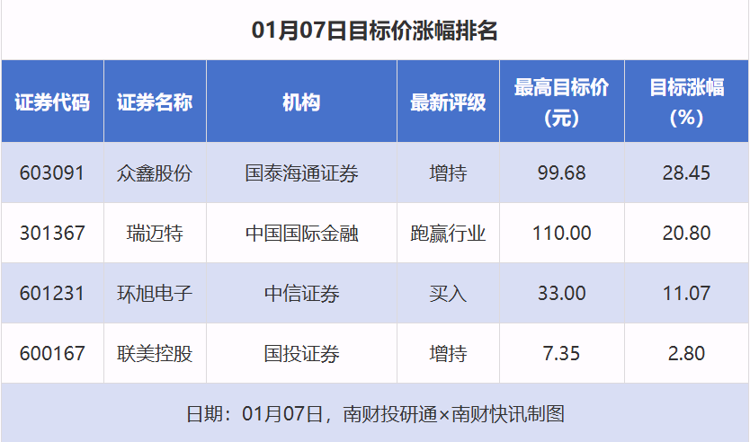 南财投研通数据显示,1月7日,券商给予上市公司目标价共4次,按最新收盘价计算,目标价涨幅排名居前的公司有众 鑫股份(603091)、瑞迈特(301367)、环旭电子(601231),目标价涨幅分别为28.45%、20.80%、11.07%,分别属 于包装印刷、医疗器械、消费电子行业。 | | | 01月07日目标价涨幅排名 | | | | | --- | --- | --- | --- | --- | --- | | 证券代码 | 证券名称 | 机构 | 最新评级 | 最高目标价 | 目标涨幅 | | | | | | (元) | (%) | | 603091 | 众鑫股份 | 国泰海通证券 | 增持 | 99.68 | 28.45 | | 301367 | 瑞迈特 | 中国国际金融 | 跑赢行业 | 110.00 | 20.80 | | 601231 | 环関电子 | 中信证券 | 买人 | 33.00 | 11.07 | | 600167 | 联美控股 | 国投证券 | 增持 | 7.35 | 2.80 | | | | 日期: 01月07日,南财投研通×南财快讯制图 | | | | | 证券代码 | 证券名 ...