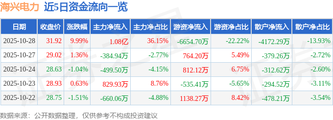 证券之星消息,海兴电力10月28日涨停收盘,收盘价31.92元。该股于9点30分涨停,1次打开涨停,截 止收盘封单资金为8174.2万元,占其流通市值0.53%。 今日海兴电力涨停的可能因素有:1、公司近期预中标国家电网及南方电网合计3.42亿元订单,强化未 来业绩确定性;2、出资3.92亿元设立新能源产业基金,加速布局储能及光储充系统领域,契合行业发 展趋势;3、2025年三季报显示第三季度净利润同比增长30.21%,业绩拐点显现,逆周期投入成效获机 构认可;4、海外业务收入占比达65%,南非水表工厂投产进一步巩固全球化布局优势,叠加智能电表 海外渗透率提升预期。 10月28日的资金流向数据方面,主力资金净流入1.08亿元,占总成交额36.15%,游资资金净流出6654.7 万元,占总成交额22.22%,散户资金净流出4172.29万元,占总成交额13.93%。 | | | | | | | 日期 收盘价 涨跌幅 主力净流入 主力净占比 游资净点比 散户净流入 散户净占比 | | | | | | --- | --- | --- | --- | --- | --- | --- | --- | | 2025-10 ...