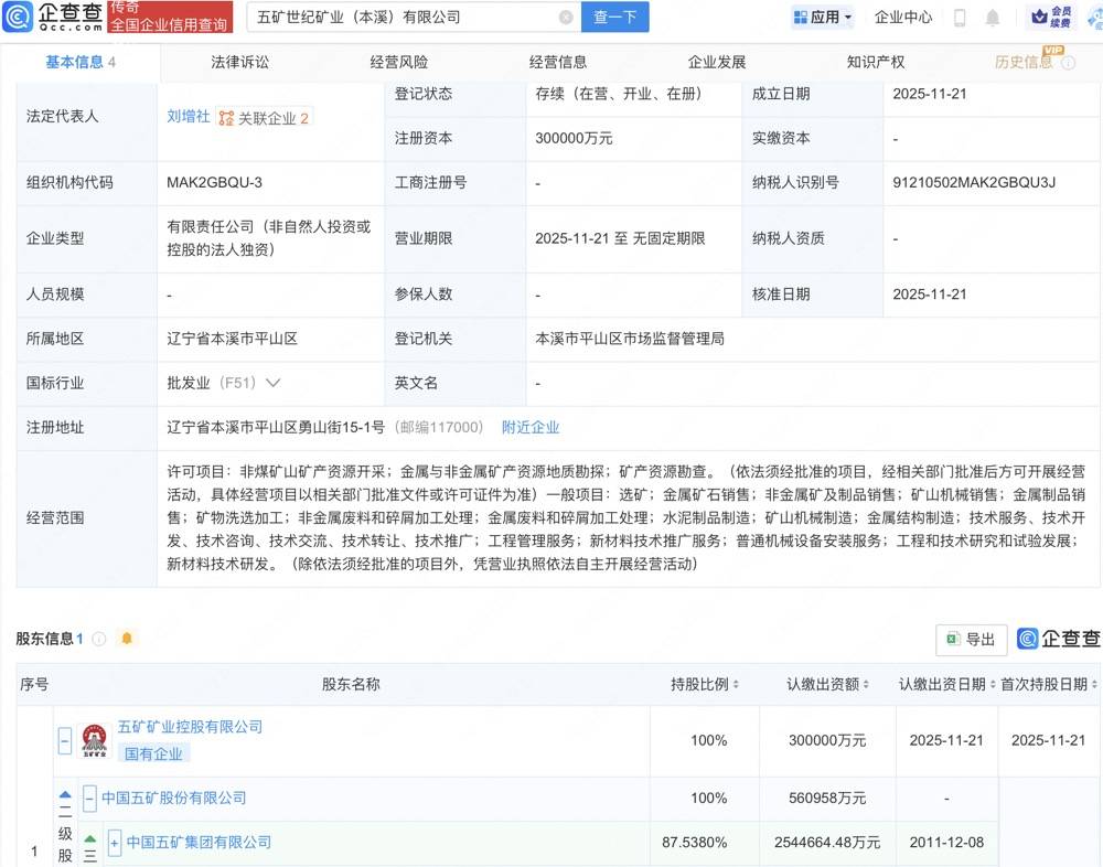 | 序号 | 股东名称 | 持股比例 = | 认缴出资额: | 认缴出资日期 = 首次持股日期 = | | --- | --- | --- | --- | --- | | | 五矿矿业控股有限公司 日本最佳 国有企业 | 100% | 300000万元 | 2025-11-21 2025-11-21 | | = | - 中国五矿股份有限公司 | 100% | 560958万元 | | | BG = | 级 ▲ L 中国五矿集团有限公司 | 87.5380% | 2544664.48万元 | 2011-12-08 | | © 北京章 全国企业信用查询 | 五矿世纪矿业(本溪)有限公司 脂应用 · 企业中心 ● 内装 > | | 8 童一下 | | | | | | --- | --- | --- | --- | --- | --- | --- | --- | | 基本信息 4 | 法律诉讼 经营信息 知识产权 | 经营风险 | | 企业发展 | | | 历史信息 ① | | 法定代表人 | 存续(在营、开业、在册) 刘增社 凉关联企业 2 | 登记状态 | | | 成立日期 | 2025-11-21 | | | ...