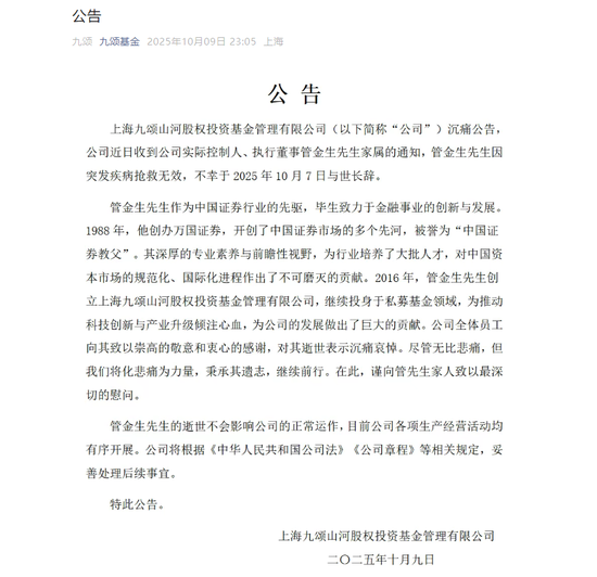 新京报贝壳财经讯(记者胡萌)10月9日晚间11点,九颂基金发布公告,公司近日收到公司实际控制人、 执行董事管金生先生家属的通知,管金生先生因突发疾病抢救无效,不幸于2025年10月7日与世长辞。 业内将其与原君安证券的张国庆、原申银证券的阚治东,并称为中国证券市场的"中国证券教父"。 1992年12月,上海证券交易所(上证所)率先在中国启动国债期货交易。1995年,因"327"国债期货重大 违规操作事件,国债期货于同年5月暂停交易。管金生也因该事件从万国证券辞职,1997年被判处有期 徒刑17年。 2016年,管金生创立上海九颂山河股权投资基金管理有限公司,继续投身于私募基金领域。 公告指出,管金生拥有深厚的专业素养与前瞻性视野,为行业培养了大批人才,对中国资本市场的规范 化、国际化进程作出了不可磨灭的贡献。公司全体员工向其致以崇高的敬意和衷心的感谢,对其逝世表 示沉痛哀悼。 中国政策科学研究会经济政策委员会副主任徐洪才在朋友圈指出,今日早晨,惊闻中国证券教父管金生 先生驾鹤西去,中国资本市场失去了一位先行者、探路人;他是我走进资本市场的领路人,也是洪略全 球智库HLC的特邀高级顾问,我们失去了一位热心肠的好 ...