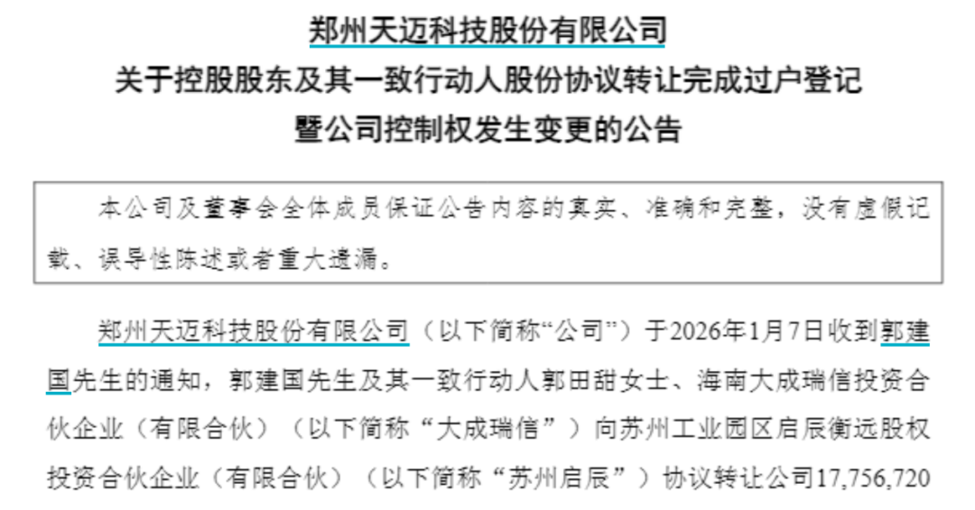 历时一年,国内知名VC机构启明创投入主天迈科技,终于正式落锤。 1月7日,天迈科技公告称,公司控股股东郭建国及其一致行动人郭田甜、海南大成瑞信投资合伙企业(有限合伙)(以下简称大成瑞信)向苏州工业园区 启辰衡远股权投资合伙企业(有限合伙)(以下简称苏州启辰)协议转让1775万股股份(占公司总股本的26.10%)的事项,已于2026年1月6日在中国证 券登记结算有限责任公司完成过户登记手续。 苏州启辰此前在公告中也明确,未来一年不会改变天迈科技主营业务,但为增强上市公司的持续发展能力和盈利能力,改善上市公司资产质量,不排除在 未来12个月内尝试对其资产、业务进行优化调整的可能。 5.41亿元,启明创投拿下一家上市公司 2024年9月,中国证监会发布的《关于深化上市公司并购重组市场改革的意见》(以下简称"并购六条")提出,支持私募投资基金以促进产业整合为目的 依法收购上市公司。 次年1月6日,上市公司天迈科技披露了与启明创投签署的股份转让协议。从首次公告到最终完成过户,历时约一年,其间一波三折,经历了交易主体变 更、价格重议等多项关键调整。 根据首次公告,天迈科技控股股东郭建国及其一致行动人郭田甜、大成瑞信,与苏 ...