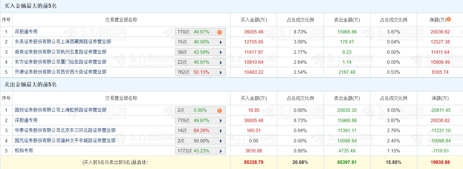 | 序号 | 交易营业部名称 | | 买入金额(万) | 占总成交比例 | | --- | --- | --- | --- | --- | | | 深股通专用 | 770次 49.87% (2) | 36005.48 | 8.73% | | 2 | 东吴证券股份有限公司上海西藏南路证券营业部 | 15次 40.00% | 12705.85 | 3.08% | | 3 | 浙商证券股份有限公司杭州五星路证券营业部 | 39次 43.59% | 11417.87 | 2.77% | | 4 | 东方证券股份有限公司厦门仙岳路证券营业部 | 22次 40.91% | 10910.64 | 2.64% | | 5 | 开源证券股份有限公司西安西大街证券营业部 | 762次 50.13% | 10493.22 | 2.54% | 云南锗业(002428.SZ)今日涨停创历史新高,换手率16.45%,成交额41.26亿元。龙虎榜数据显示,深股通买入3.6亿元,卖出1.6亿元,净买入2亿元;游资"山 东帮"位列买四席位,净买入1.09亿元;"量化打板"位列买五席位,净买入8306万元;"温州帮"位列卖四席位,净卖出1.01 ...