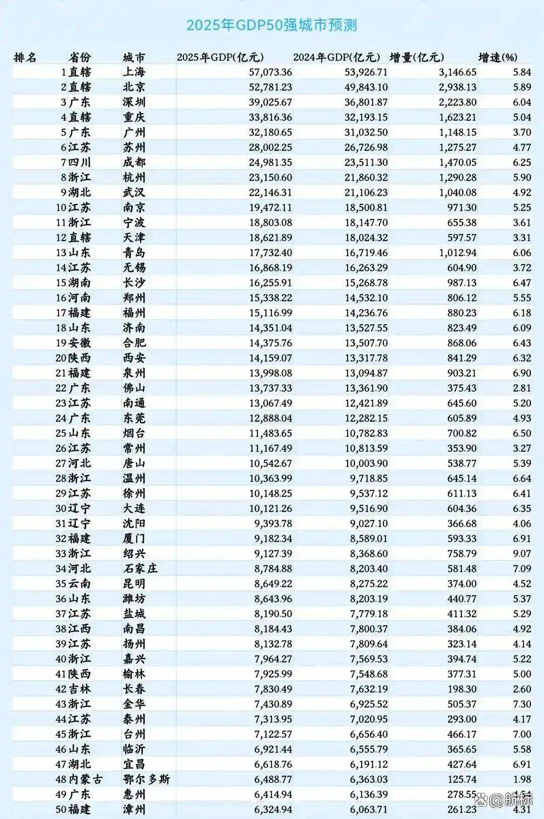 当 2025 年 GDP50 强城市的预测榜单摆在眼前,你会发现:这不仅是一串数字,更是中国城市经济 "竞跑" 的鲜活切片 —— 超 2 万亿的 "头部梯队" 站稳脚 跟,万亿级城市扩容提速,而增速榜上的 "黑马",藏着各地发展的真功夫。 | 排名 | 省份 | 城市 | 2025年GDP(亿元) | 2024年GDP(亿元) 增量(亿元) | | 增速(%) | | --- | --- | --- | --- | --- | --- | --- | | | 1直辖 | 上海 | 57,073.36 | 53,926.71 | 3,146.65 | 5.84 | | | 2直辖 | 北京 | 52,781.23 | 49,843.10 | 2,938.13 | 5.89 | | | 3 广东 | 深圳 | 39,025.67 | 36,801.87 | 2,223.80 | 6.04 | | | 4直辖 | 重庆 | 33,816.36 | 32,193.15 | 1,623.21 | 5.04 | | | 5 广东 | 广州 | 32,180.65 | 31,032.50 | 1,148.15 | 3.70 ...