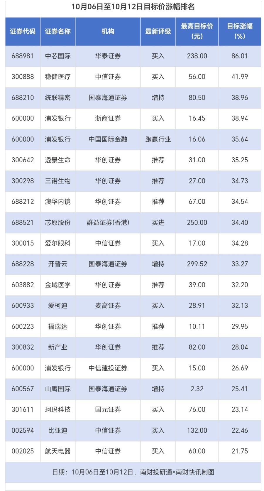 南财投研通数据显示,10月6日至10月12日,券商给予上市公司目标价共35次,按最新收盘价计算,目标价涨幅排名居前的公司 有中芯国际、稳健医疗、统联精密,目标价涨幅分别为86.01%、41.99%、38.96%,分别属于半导体、个护用品、消费电子行 业。 | 600000 | 浦发银行 | 中信建投证券 | 买入 | 15.00 | 26.69 | | --- | --- | --- | --- | --- | --- | | 600567 | 山鹰国际 | 国泰海通证券 | 增持 | 2.32 | 25.41 | | 301611 | 珂玛科技 | 国元证券 | 买入 | 76.00 | 23.14 | | 002594 | 比亚迪 | 中信证券 | 买入 | 132.00 | 22.46 | | 002025 | 航天电器 | 中信证券 | 买入 | 60.00 | 21.75 | | | | | 日期:10月06日至10月12日,南财投研通×南财快讯制图 | | | 从券商推荐家数来看,10月6日至10月12日有128家上市公司得到券商推荐,其中浦发银行、比亚迪、赛力斯均获得3家推荐。 首次覆盖方面,1 ...