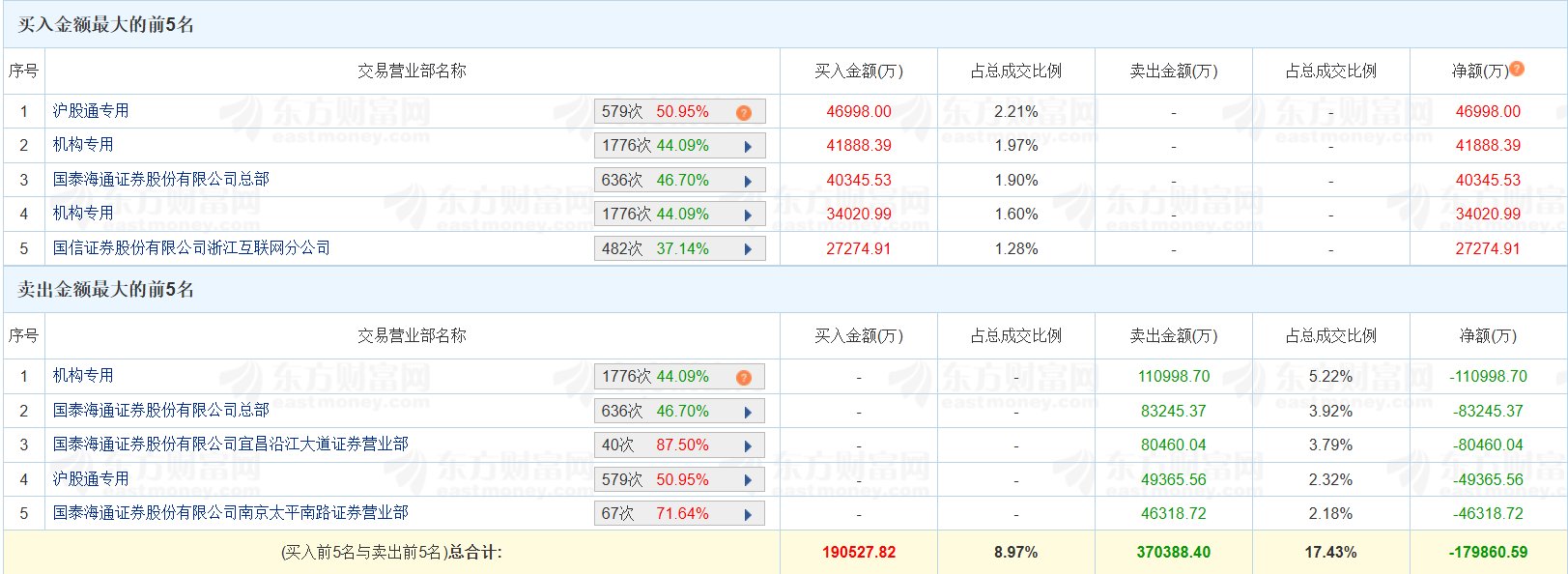 | 序号 | 交易营业部名称 | | | 买入金额(万) | 占总成交比例 | | --- | --- | --- | --- | --- | --- | | 1 | 沪股通专用 | 579次 50.95% | C | 46998.00 | 2.21% | | 2 | 机构专用 | 1776次 44.09% | ▲ | 41888.39 | 1.97% | | 3 | 国泰海通证券股份有限公司总部 | 636次 46.70% | A | 40345.53 | 1.90% | | 4 | 机构专用 | 1776次 44.09% | ▶ | 34020.99 | 1.60% | | 5 | 国信证券股份有限公司浙江互联网分公司 | 482次 37.14% | ▲ | 27274.91 | 1.28% | | | 卖出金额最大的前5名 | | | | | | 序号 | 交易营业部名称 | | | 买入金额(万) | 占总成交比例 | | 1 | 机构专用 | 1776次 44.09% | 2 | | | | 2 | 国委按申正案的分目的公司目前 | 636次 46.70% | A | | | | 3 | 国泰海通证 ...