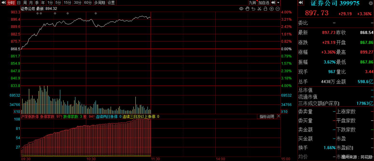 证券公司指数半日大涨3.36%,华林证券涨停,华安证券等多股涨超5%