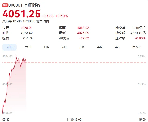 1月6日早盘,上证指数突破前期高点4034.08点,刷新10年来新高。这是继2025年11月14日之后,沪指 再度刷新10年高点。 从盘面上看,半导体设备指数盘中强势拉升,成分股呈现普涨格局。与此同时,脑机接口、固态电池板 块开盘均呈现活跃状态,推动了股指大幅拉升。 1月5日,高盛发布最新研报,预测2026年中国实际GDP增速高于市场共识预测,并建议高配中国股票。 高盛股票策略团队预计2026年和2027年中国股市将每年上涨15%至20%,分别由14%和12%的盈利增长 以及约10%的估值向上重估所支撑。盈利增长潜在再加速的关键驱动因素包括人工智能应用、"出海"趋 势和 "反内卷"政策。此外,中国股市当前估值相比全球同业存在显著折价,对于国内外投资者显著的 分散化配置价值应会鼓励更多资本流入市场。 来源:智通财经 此前的隔夜市场上,富时A50期指连续夜盘收涨0.58%,报15572点。中国资产低开后大幅拉升,热门中 概股多数上涨,纳斯达克中国金龙指数涨0.49%。 有券商研究机构表示,在弱美元和国内政策催化下,更多海外资金和长线资金入市有望从资金端提振A 股。 自2025年12月17日至2026年1月5日,上 ...