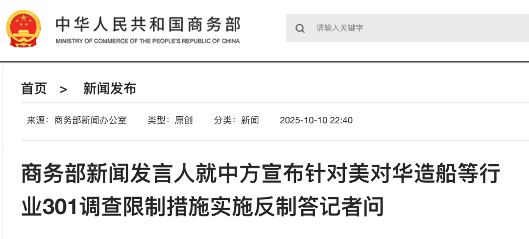 针对美对华造船等行业301调查限制措施,中方宣布实施反制!商务部:是“正当防卫”