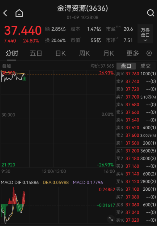 上证报中国证券网讯(记者 何漪)1月9日,金浔资源在港交所主板上市。开盘后,金浔资源表现活 跃。截至10点38分,金浔资源报37.44港元/股,上涨24.8%,成交额达到2.85亿港元。 | < 日 | 金浔资源(3636) | | | | --- | --- | --- | --- | | | 01-09 10:38:08 | | | | | 20.6 37.440 额2.85亿 股本 1.47亿 市盈™ | | 万得 | | | | | 盟口 | | | 7.440 24.80% 换 20.66% 市值 55亿 市净 7.51 | | | | से स्व | 曲家 田 周K 月K | | | | 營加 | 均价:37.565 盘口 成交 | | | | | ------- 26.93%- 卖10 37.760 1000(1) | | | | | 卖9 37.740 -- (0) | | | | | 卖8 37.720 -- (0) | | | | | 卖7 37.700 5.10万(4) | | | | | 卖6 37.680 -- (0) | | | | 30.000 | 0.000 25 37.66 ...