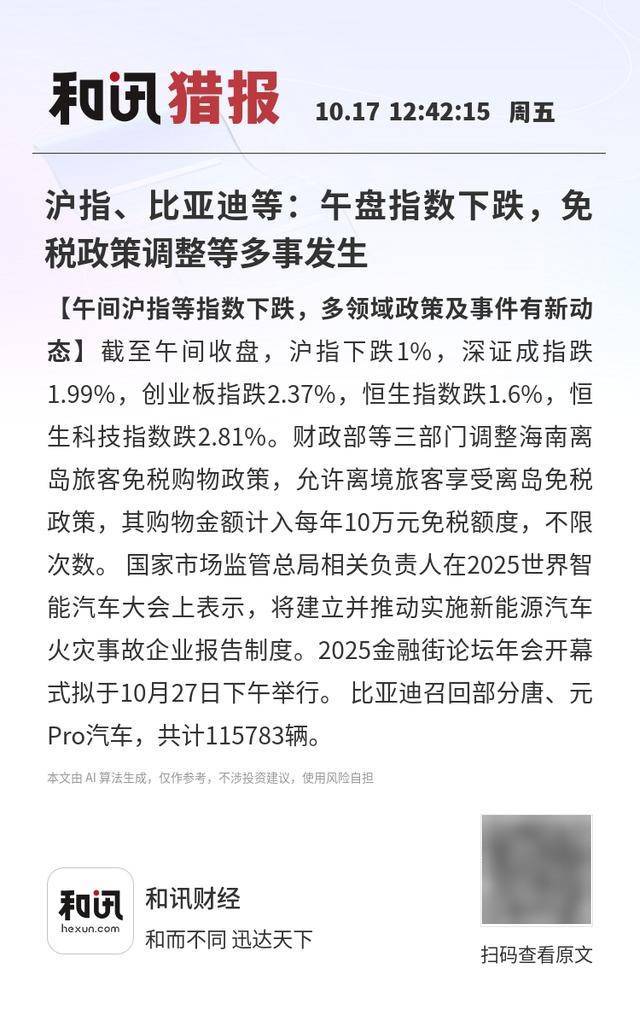 【午间沪指等指数下跌,多领域政策及事件有新动 态】截至午间收盘,沪指下跌1%,深证成指跌 1.99%,创业板指跌2.37%,恒生指数跌1.6%,恒 生科技指数跌2.81%。财政部等三部门调整海南离 岛旅客免税购物政策,允许离境旅客享受离岛免税 政策,其购物金额计入每年10万元免税额度,不限 次数。国家市场监管总局相关负责人在2025世界智 能汽车大会上表示,将建立并推动实施新能源汽车 火灾事故企业报告制度。2025金融街论坛年会开幕 式拟于10月27日下午举行。比亚迪召回部分唐、元 Pro汽车,共计115783辆。 本文由 Al 算法生成,仅作参考,不涉投资建议,使用风险自担 【午间沪指等指数下跌,多领域政策及事件有新动态】截至午间收盘,沪指下跌1%,深证成指跌 1.99%,创业板指跌2.37%,恒生指数跌1.6%,恒生科技指数跌2.81%。财政部等三部门调整海南离岛旅 客免税购物政策,允许离境旅客享受离岛免税政策,其购物金额计入每年10万元免税额度,不限次数。 国家市场监管总局相关负责人在2025世界智能汽车大会上表示,将建立并推动实施新能源汽车火灾事故 企业报告制度。2025金融街论坛年会开幕式拟于10月 ...