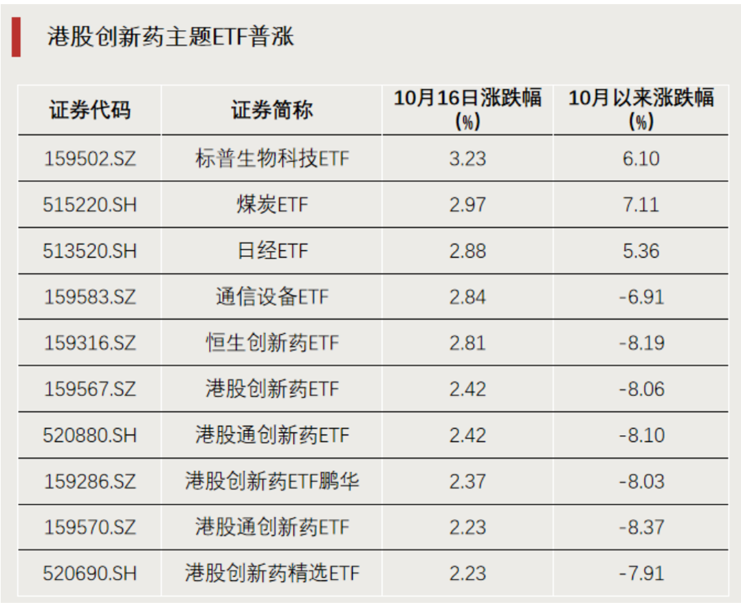 01 10月16日,A股三大指数涨跌不一,上证指数涨0.1%,深证成指跌0.25%,创业板指涨0.38%。全市场1300余只ETF中,约580只ETF收涨。 02 10月16日,稀土主题ETF回调明显。全市场ETF跌幅前四均为稀土ETF,单日跌幅均超过2%。这4只产品全部挂钩稀土产业指数,该指数包括42只成分 股,截至收盘,39只下跌,其中盛和资源跌超7%。此外,多只机器人主题ETF也出现不同程度下跌。 10月16日,港股创新药主题ETF普涨,6只基金跻身ETF涨幅榜前十,涨幅均超2%。此外,2只跨境ETF以及1只主投煤炭领域的ETF涨幅居前。 03 资金流向方面,前一交易日(10月15日),全市场ETF资金净流入额超100亿元。有4只ETF单日获净流入额超10亿元,涵盖主投黄金、稀土、沪深300等 领域的产品,以及货基ETF。 港股创新药ETF普涨 10月16日,港股创新药板块表现亮眼,6只相关ETF跻身ETF涨幅榜前十,涨幅均超2%。这6只产品共挂钩3类指数,其中,3只产品挂钩港股通创新药指 数,2只产品挂钩恒生港股通创新药精选指数,1只产品挂钩恒生港股通创新药。 港股通创新药指数包括32只成分股,恒生港 ...