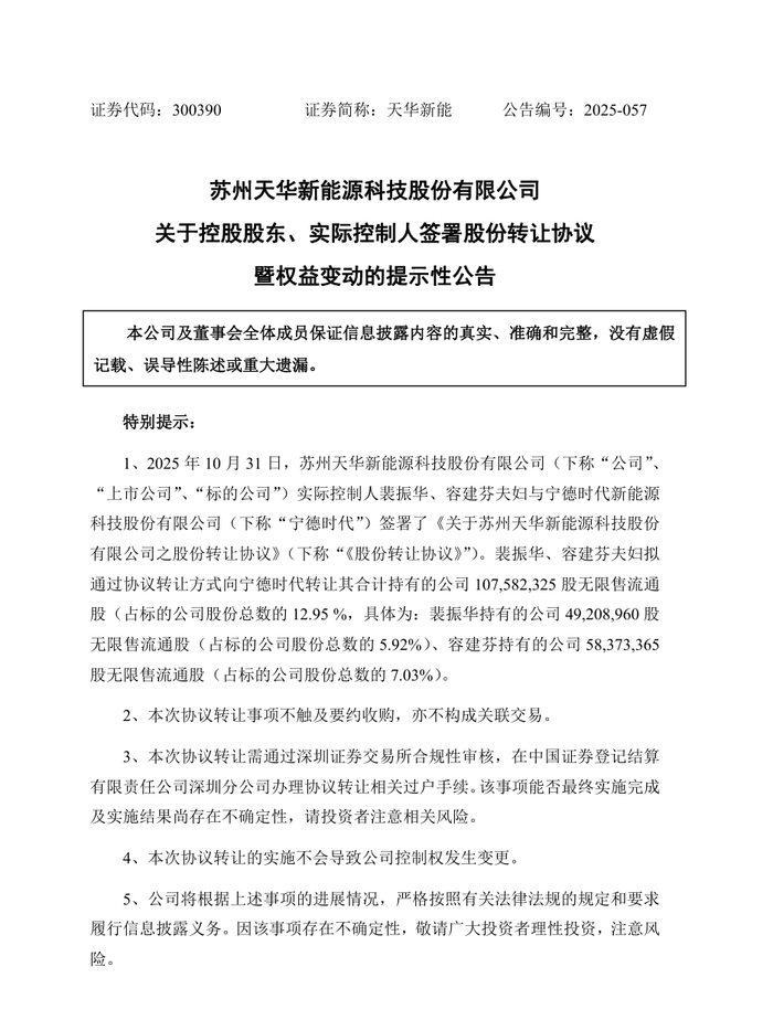 #天华新能实控人夫妇作价26亿转让股票#【#宁德时代与中创新航均入股材料企业#】10月31日晚间,天 华新能发布公告称,公司实控人裴振华、容建芬夫妇拟通过协议转让方式,向宁德时代合计转让所持 12.95%的公司股份,转让价款合计达26.35亿元。 同日晚间,盛新锂能发布公告称,公司终止筹划港股IPO事项,并且拟通过定增方式引入战略投资者, 包括中创新航、华友控股集团有限公司。 宁德时代、中创新航均是锂电池头部企业,而天华新能、盛新锂能均是锂电池上游的材料龙头。在上一 轮锂电池产业高峰期,类似的资本运作频繁出现。彼时,锂电池头部企业拟入股材料企业的方式,加大 对上游原材料的把控力度,从而保障自身供应链的稳定。 如今,锂电池行业正在迎来上升期。恩捷股份董事长李晓明近日表示:"预计未来几年,隔膜和整个锂 电池行业仍会保持较高增长态势。"(中国基金报) 证券代码:300390 苏州天华新能源科技股份有限公司 关于控股股东、实际控制人签署股份转让协议 暨权益变动的提示性公告 本公司及董事会全体成员保证信息披露内容的真实、准确和完整,没有虚假 记载、误导性陈述或重大遗漏。 特别提示: 1、2025年10月31日,苏州天华 ...
