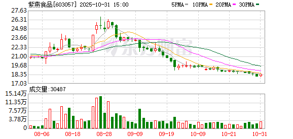 证券时报·数据宝统计显示,紫燕食品今日收盘价为18.35元,上涨1.66%,日换手率为0.74%,成交额为 5568.32万元,全天主力资金净流出218.13万元,近5日该股累计下跌2.19%,近5日资金合计净流出 763.54万元。 机构评级来看,近5日共有3家机构给予该股评级,预计目标价最高的是华创证券,10月27日华创证券发 布的研报预计公司目标价为19.80元。 | 成交量 | 成交金 | 成交价 | 相对当日收 | | | | --- | --- | --- | --- | --- | --- | | (万 | 额(万 | 格 | 盘折溢价 | 买方营业部 | 卖方营业部 | | 股) | 元) | (元) | (%) | | | | | | | | 广发证券股份有限公司广州 | 广发证券股份有限公司上 | | 141.73 | 2303.12 | 16.25 | -11.44 | 马场路广发证券大厦证券营 | 海浦东新区东方路证券营 | | | | | | 业部 | 业部 | | | | | | 广发证券股份有限公司广州 | 广发证券股份有限公司上 | | 141.73 | 2303.12 | 1 ...