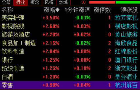 早盘,A股大消费(核心股)板块走强,美容护理、旅游、食品、零售、影视(核心股)等方向纷纷拉 升。拉芳家化、安记食品、海欣食品、红棉股份、杭州解百、浙文影业、横店影视等多股涨停。 | 美部 行业 | 概念 风格 地域 | 30 | | | --- | --- | --- | --- | | 名称 | | 涨幅� 1分钟涨速 涨停数 | 领涨股 | | 美容护理 | +3.50% | -0.03% | - 拉芳家化 | | 影视院线 | +2.68% | +0.03% | - 横店影视 | | 旅游及酒店 | +2.20% | +0.02% | 0 黄山旅游 | | 食品加工制造 | +2.15% | -0.02% | 2 海欣食品 | | 饮料制造 | +2.04% | +0.00% | 2 红棉股份 | | 银行 | +1.25% | +0.00% | E 厦门银行 | | 纺织制造 | +1.25% | +0.10% | 2 浙文影业 | | 白酒 | +1.20% | -0.03% | 0 皇台酒业 | | 零售 | +0.98% | +0.04% | 1 杭州解百 | 消息面上,国务院新闻办公室将于20 ...