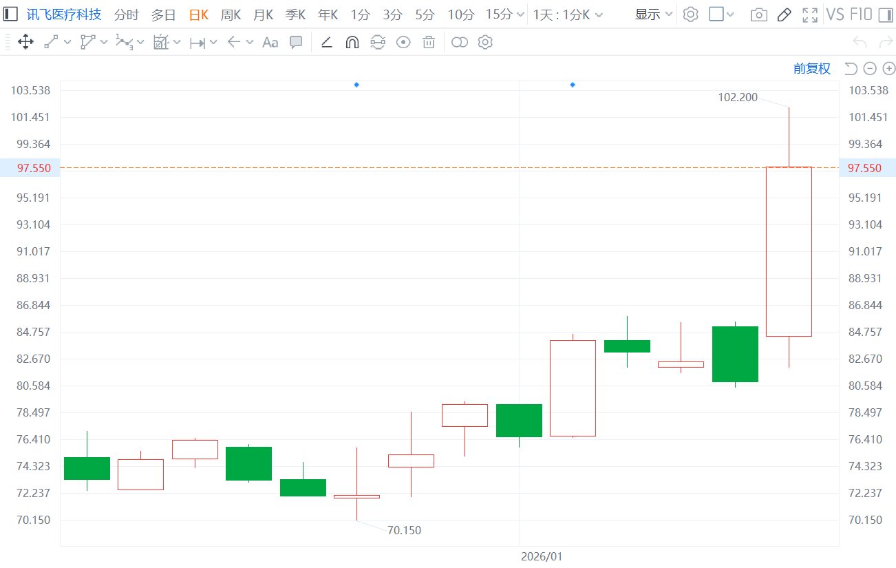 港股异动丨讯飞医疗科技大涨26%股价创3个月新高 “AI+医疗”迎政策春风 重要股东延长禁售彰显坚定信心