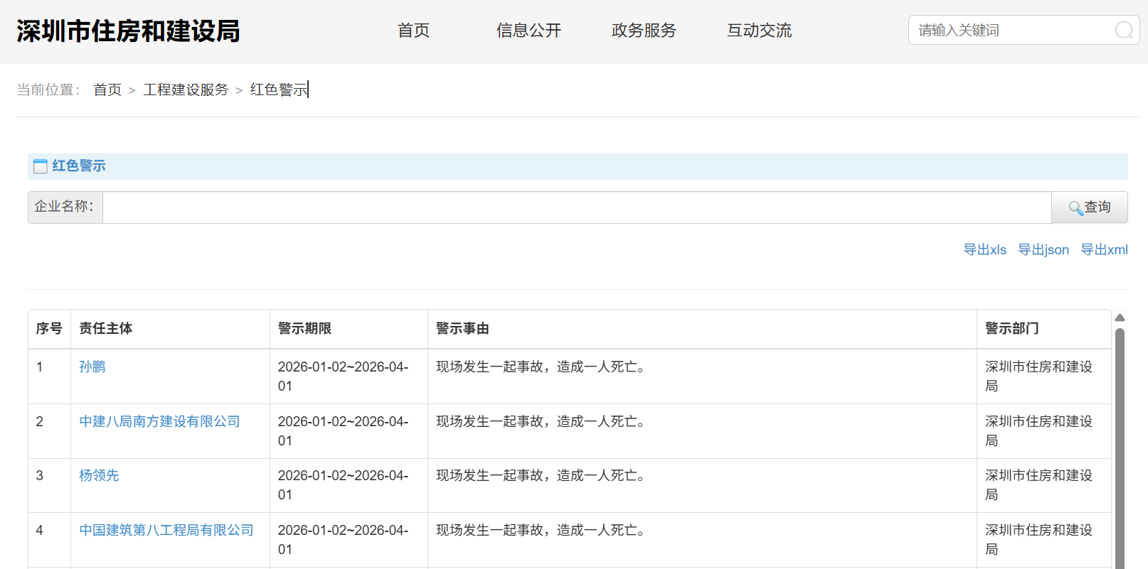 南都·湾财社记者从深圳市住房和建设局官网获悉,中国建筑第八工程局有限公司(以下简称"中建八局")、中建八局南方建设有限公司及其相关人员近日 被深圳住房和建设局处以红色警示3个月,警示时间段为2026年1月2日至2026年4月1日。警示事由为现场发生一起事故,造成一人死亡。 | 信息公开 | 政务服务 | 互动交 | | --- | --- | --- | | 首页 | | | | □ 红色警示 | | --- | | 企业名称: | | 序号 | 责任主体 | 警示期限 | 警示事由 | | --- | --- | --- | --- | | 1 | 孙鹏 | 2026-01-02~2026-04- 01 | 现场发生一起事故,造成一人死亡。 | | 2 | 中建八局南方建设有限公司 | 2026-01-02~2026-04- 01 | 现场发生一起事故,造成一人死亡。 | | 3 | 杨领先 | 2026-01-02~2026-04- 01 | 现场发生一起事故,造成一人死亡。 | | ব | 中国建筑第八工程局有限公司 | 2026-01-02~2026-04- 01 | 现场发生一起事故,造成一人死亡。 ...