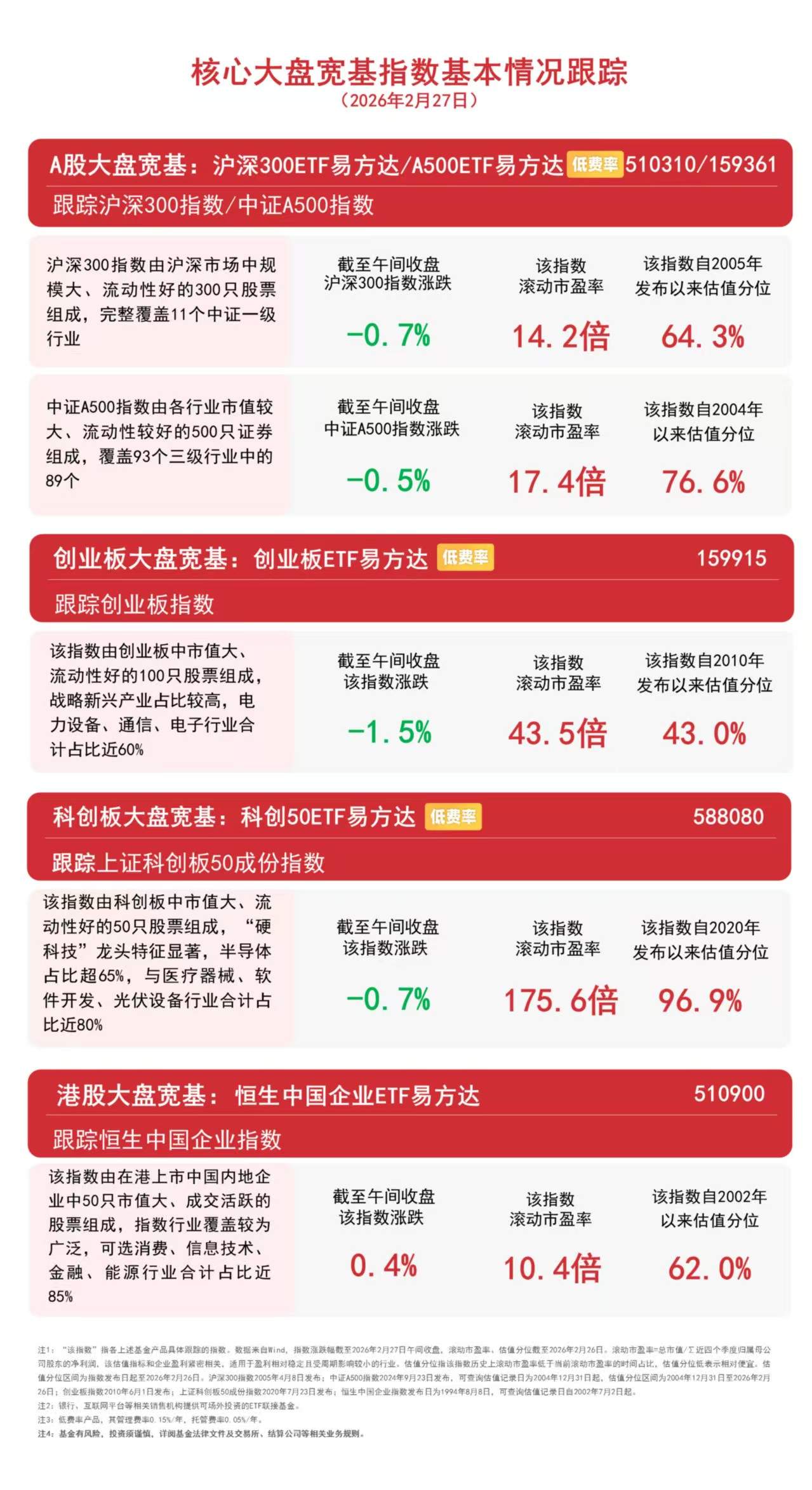 2月26日早盘,A股三大指数涨跌不一,沪指微跌0.08%,沪深京三市半日成交额约1.65万亿元,较昨日半天放量超1100亿元。板 块题材上,CPO、光纤、铜缆高速连接、PCB、液冷服务器、电网设备、培育钻石、航空发动机板块涨幅居前,影视院线、保 险、房地产、汽车整车、环氧丙烷、短剧游戏、建筑材料、免税店板块跌幅居前;港股延续调整,医药、科技、非银金融板块跌 幅居前。 | 创业板大盘宽基:创业板ETF易方达 低费率 | | | 159915 | | --- | --- | --- | --- | | 跟踪创业板指数 | | | | | 该指数由创业板中市值大、 | 截至午间收盘 | 该指数 | 该指数自2010年 | | 流动性好的100只股票组成, | 该指数涨跌 | 滚动币盈率 | 发布以来估值分位 | | 战略新兴产业占比较高,电 | | | | | 力设备、通信、电子行业合 | -0. 4% | 43.6倍 | 43. 3% | | 计占比近60% | | | | | 科创板大盘宽基:科创50ETF易方达 佃费率 | | | 588080 | | 跟踪上证科创板50成份指数 | | | | | 该指数由 ...